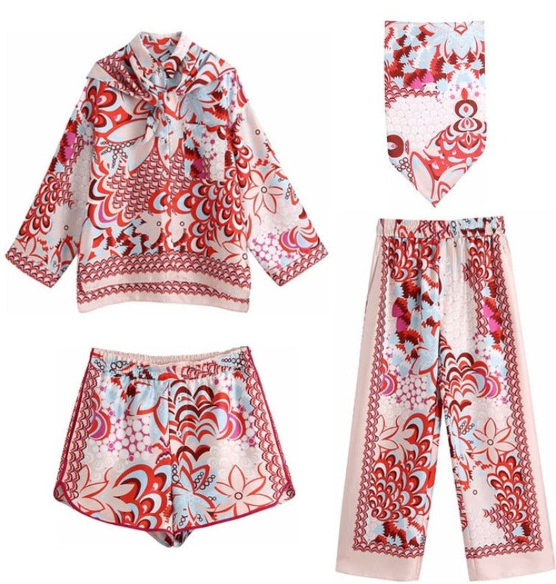 ANGELA SET has an absolutely cute pattern. You can choose 4 items: Shirt. Pants. Shirts. and Headscarf. This set is perfect for the summer season.