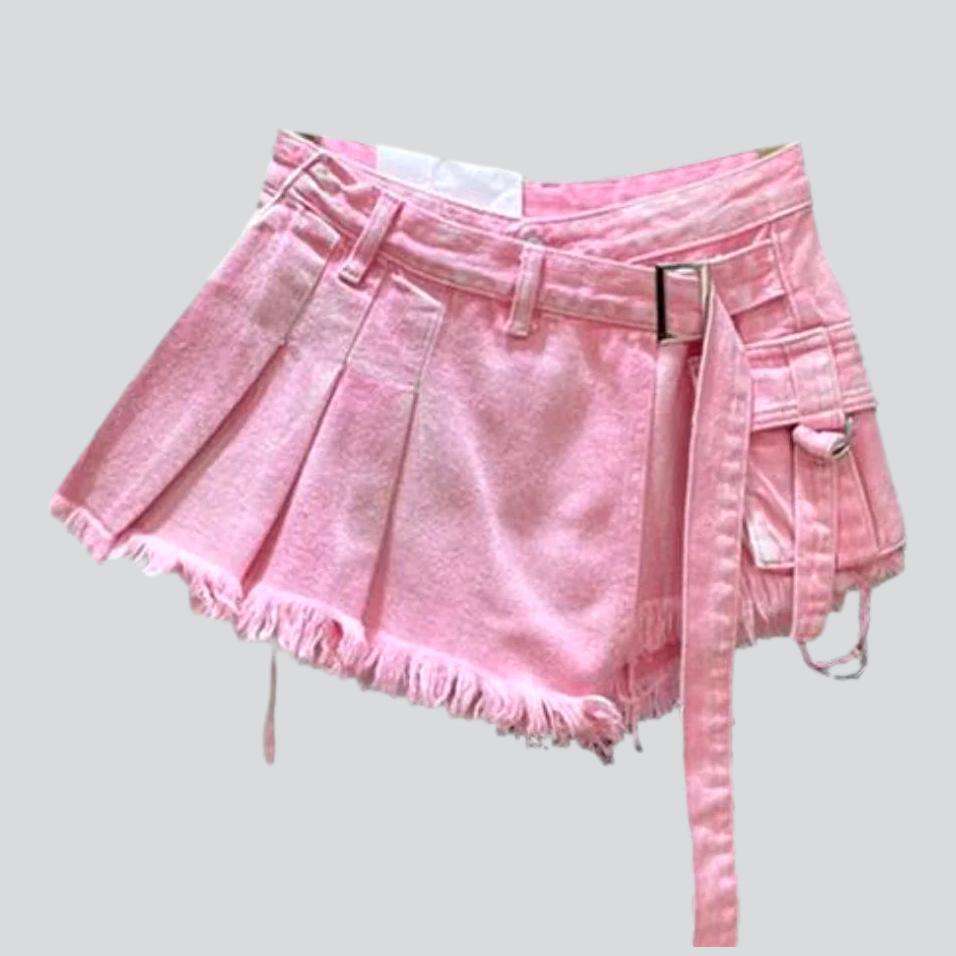 Look fashion-forward and keep up with the latest trends with our Asymmetric Pleated Mini Denim Skort from the 2023 Summer Collection! This mid-waist skort features an asymmetric cut. pleated detailing. zipper & button closure. and a vibrant color that's sure to turn heads wherever you go.