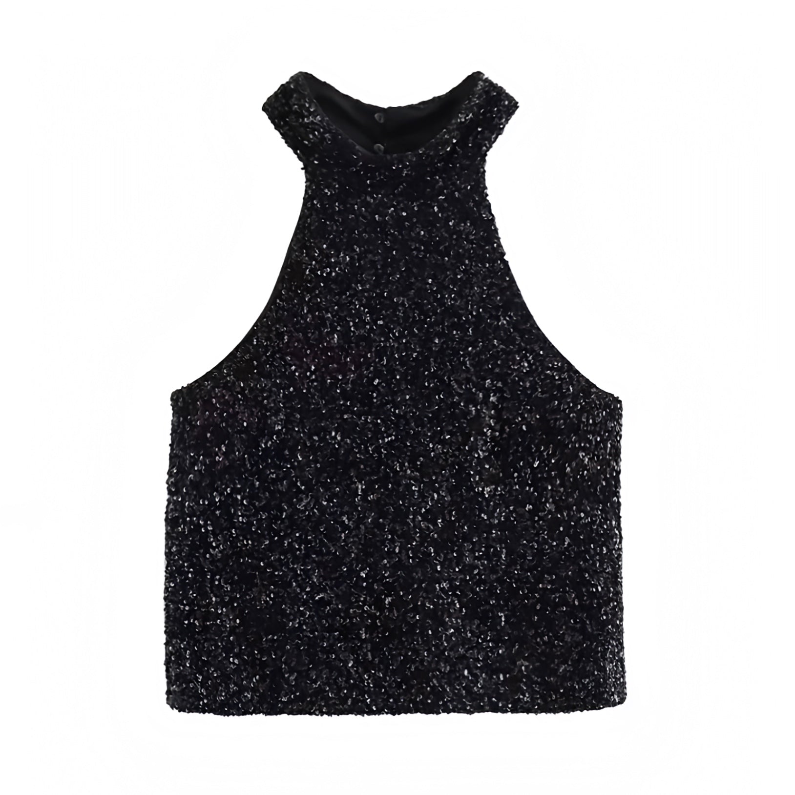 Black Sequined Glitter Slim Fit Sleeveless Halter Crop Tank Top Details: