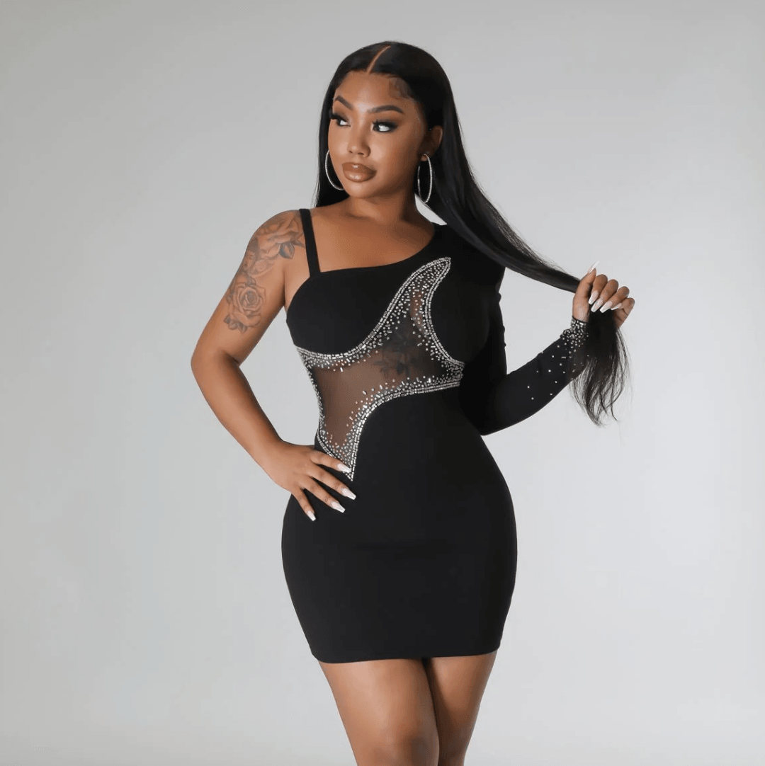 Catch-a-Star Mesh Bandage Mini Dress �a luxurious blend of elegance and allure. This black mini bandage dress features a single long sleeve adorned with intricate beading and mesh details. creating a captivating ensemble that's perfect for those special occasions.