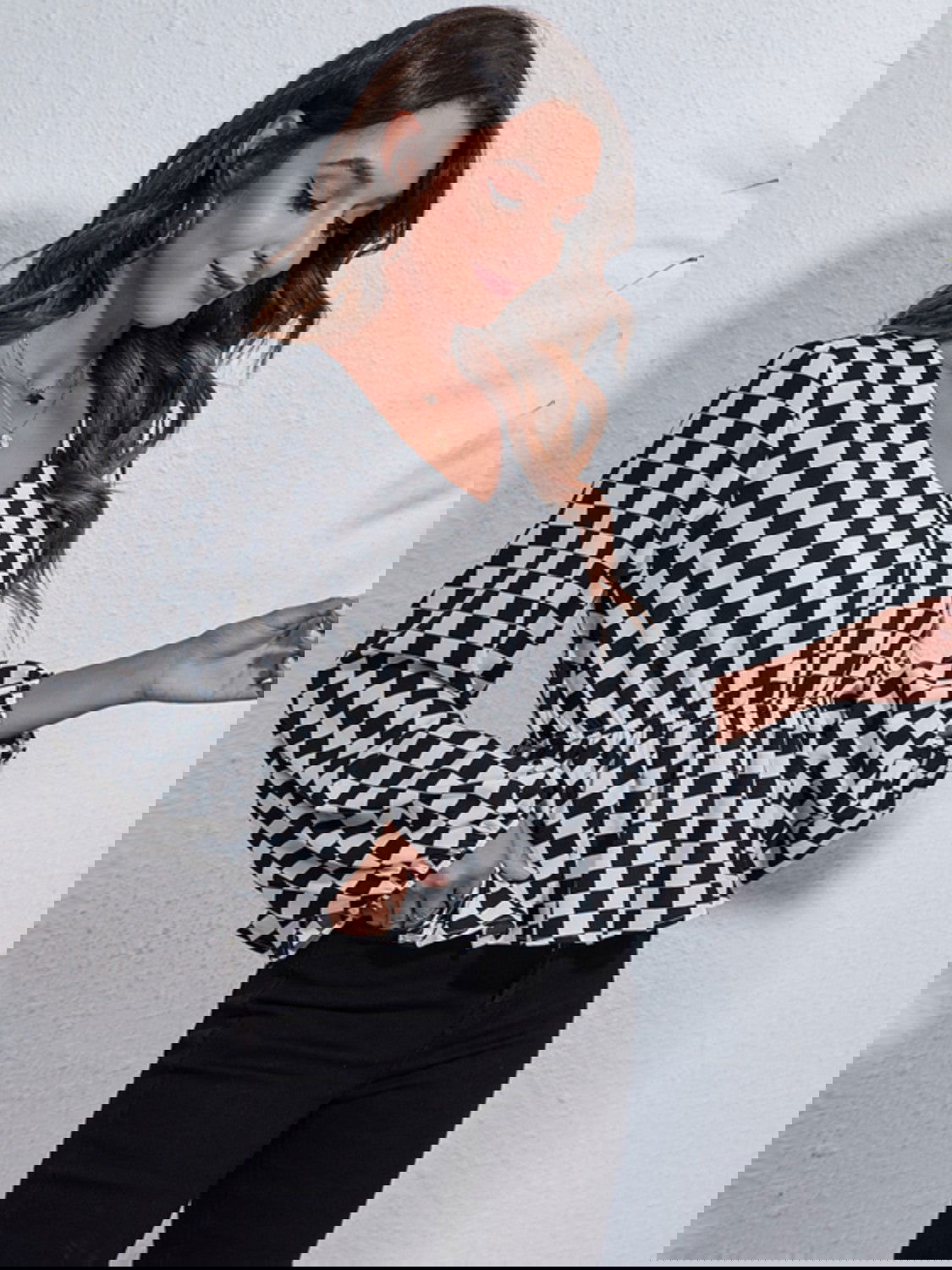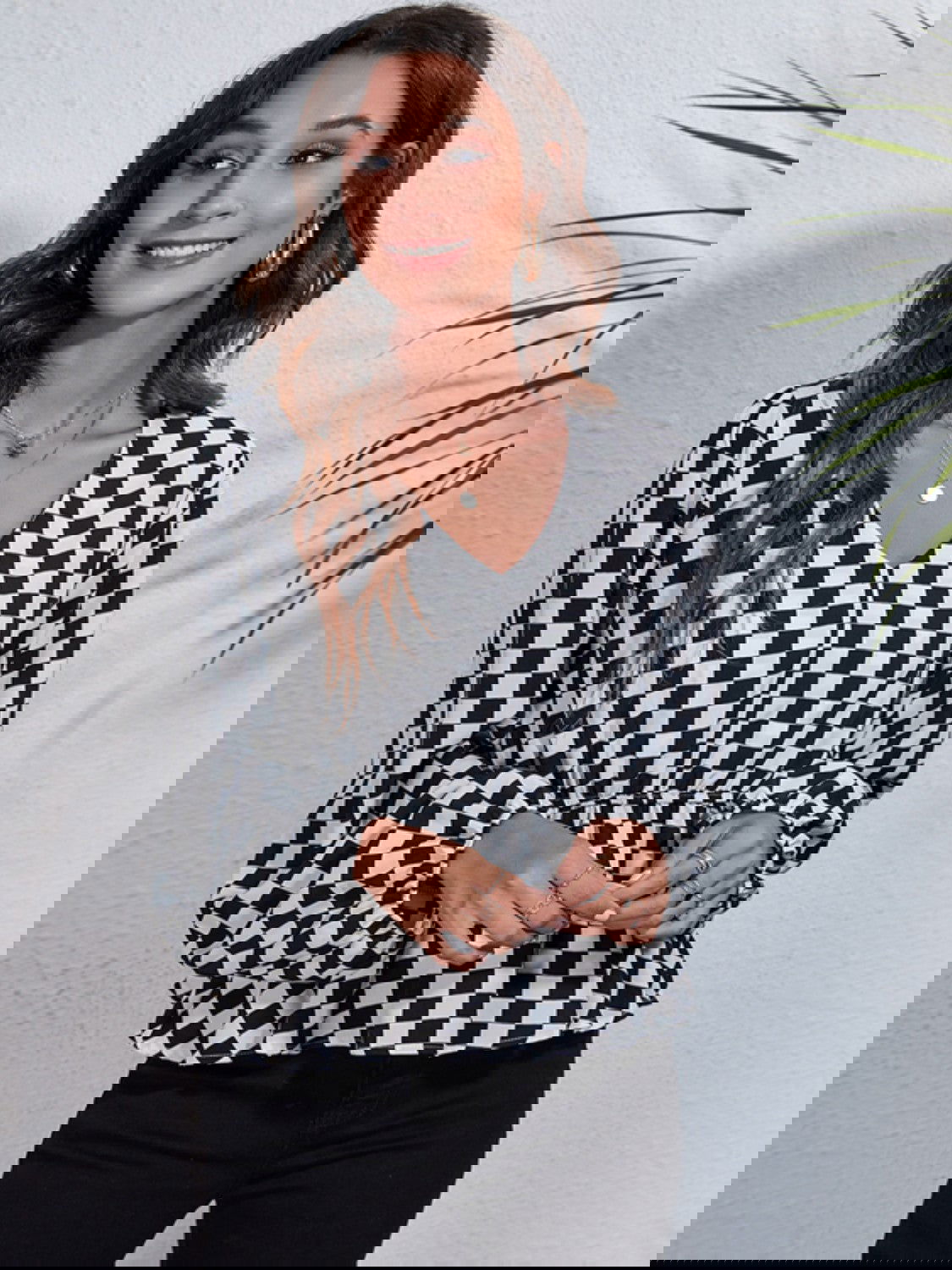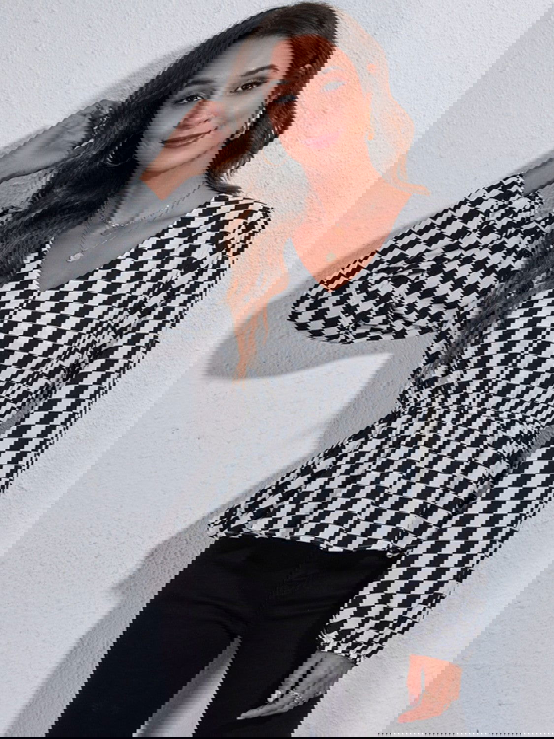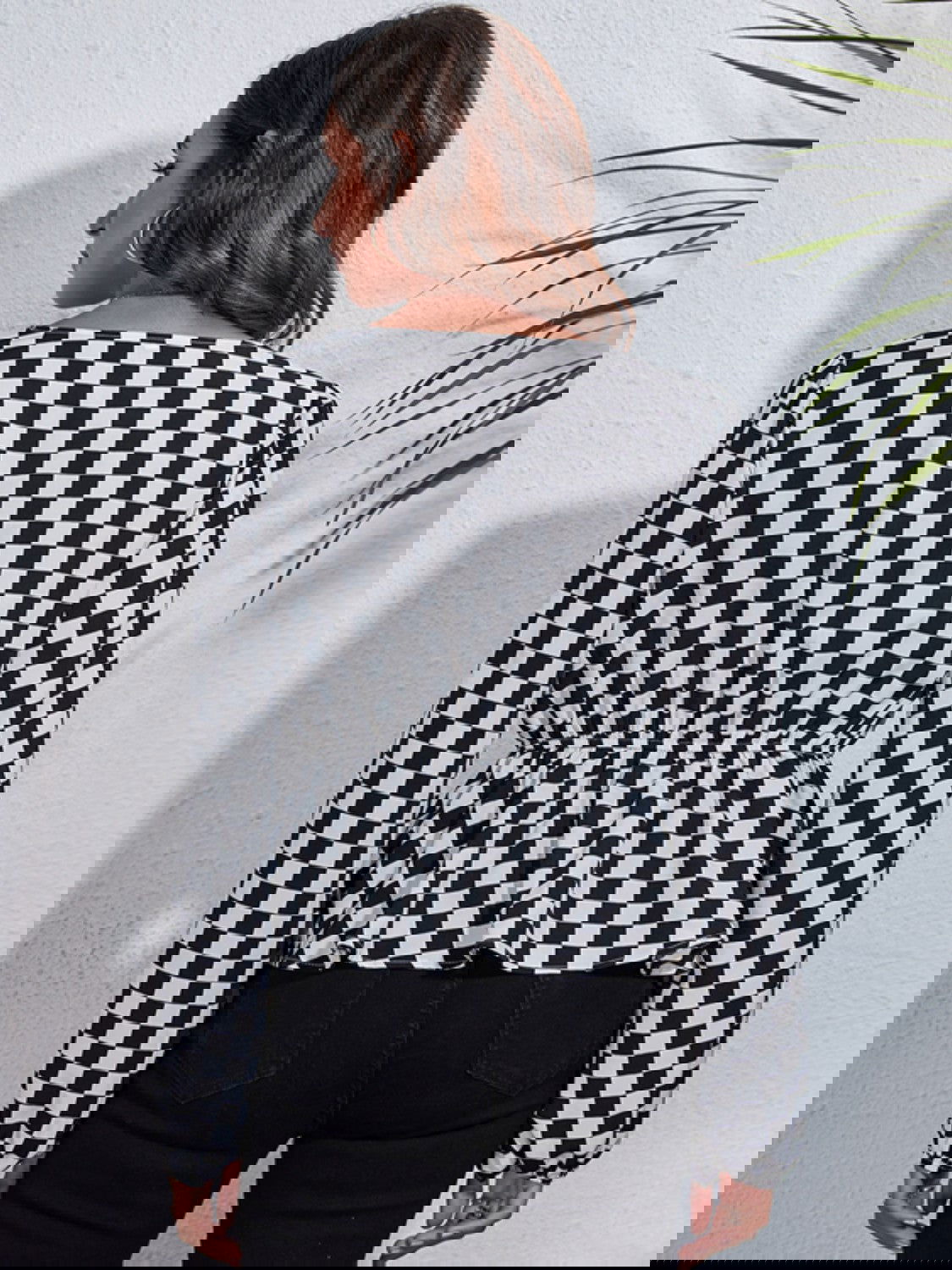 Introducing the Checkered Elegance Peplum Blouse. a modern twist on a classic style. This blouse features a striking black and white checkered pattern and a flattering peplum silhouette. Made from 100% polyester. it offers an opaque. comfortable fit without any stretch. Perfect for both casual and professional settings. this blouse pairs effortlessly with jeans. trousers. or skirts for a polished look.
