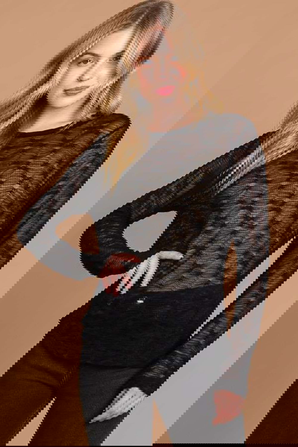 The Captivating Edge Round Neck Mesh Perspective Top is a trendy and alluring piece that will make a statement in your wardrobe. With its round neck and mesh fabric. this top exudes modernity and edge. The mesh perspective detail adds a touch of subtle allure to your outfit. Made from lightweight and breathable material. this top offers both comfort and style. Pair it with high-waisted jeans for a casual look or layer it with a cami and skirt for a more dressed-up ensemble. Embrace your confidence and express your unique style with this captivating top.