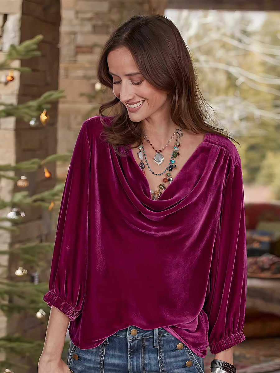 This Women's T-Shirts Gold Velvet Pile Neck Pleated Long Sleeve T-Shirt is sure to make a statement. It's made of soft and comfortable velvet. has a pleated neck. and long sleeves. It's perfect for any occasion.