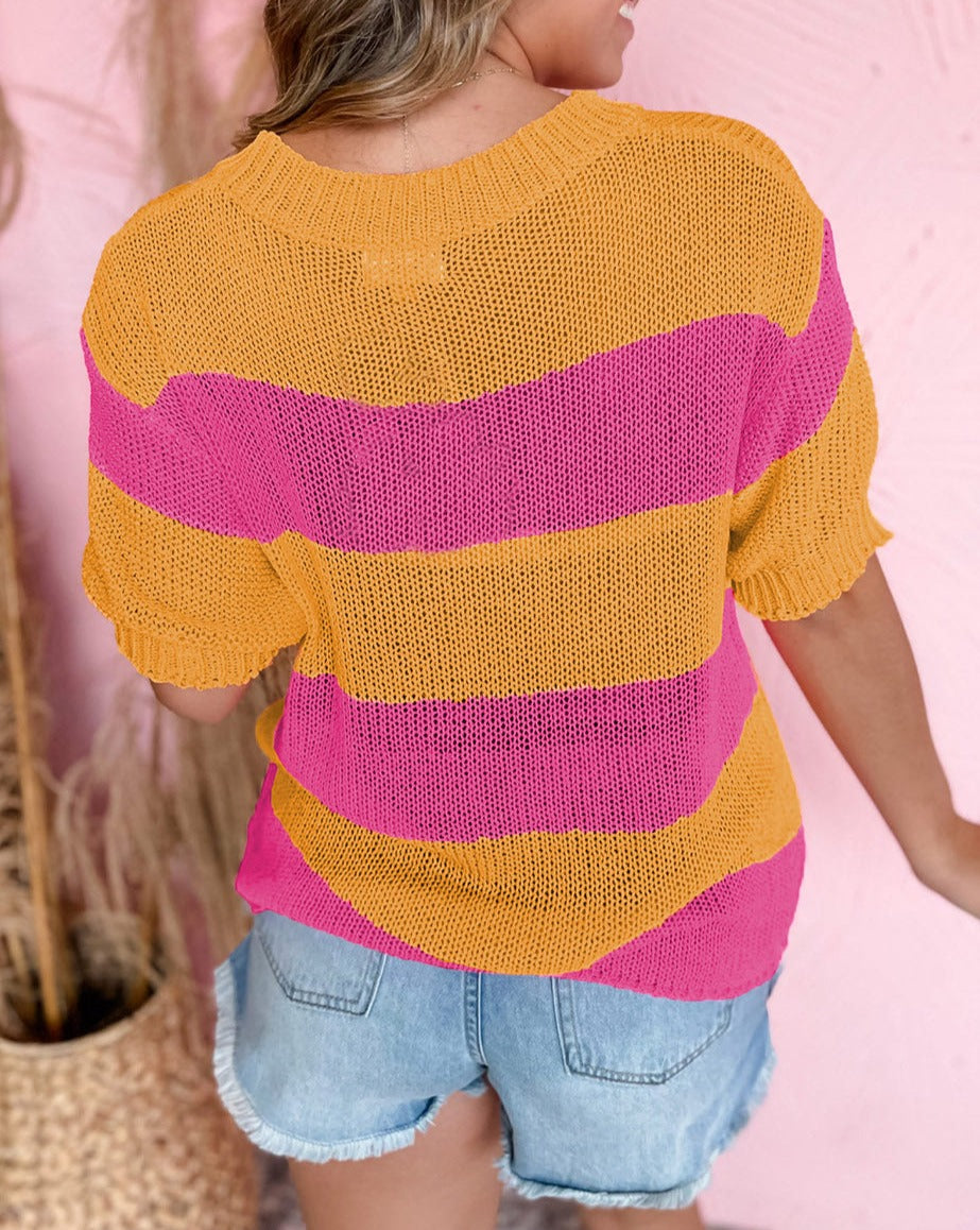 This knitted t-shirt sweater features a vibrant orange stripe that is sure to catch the eye. The color block design adds a touch of sophistication. while the round neck and half sleeves provide a cozy fit. Perfect for warmer days. this sweater is a must-have addition to your wardrobe. Cotton/Acrylic