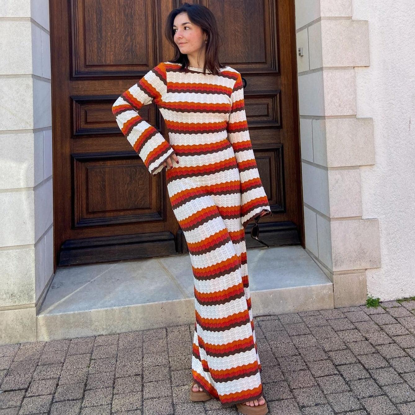 Crafted from cotton. the dress ensures both a soft touch against the skin and a body-hugging silhouette. The backless feature adds a touch of allure and modernity. creating a captivating focal point. The striped pattern and hollowed-out detailing contribute to a visually dynamic and stylish aesthetic.