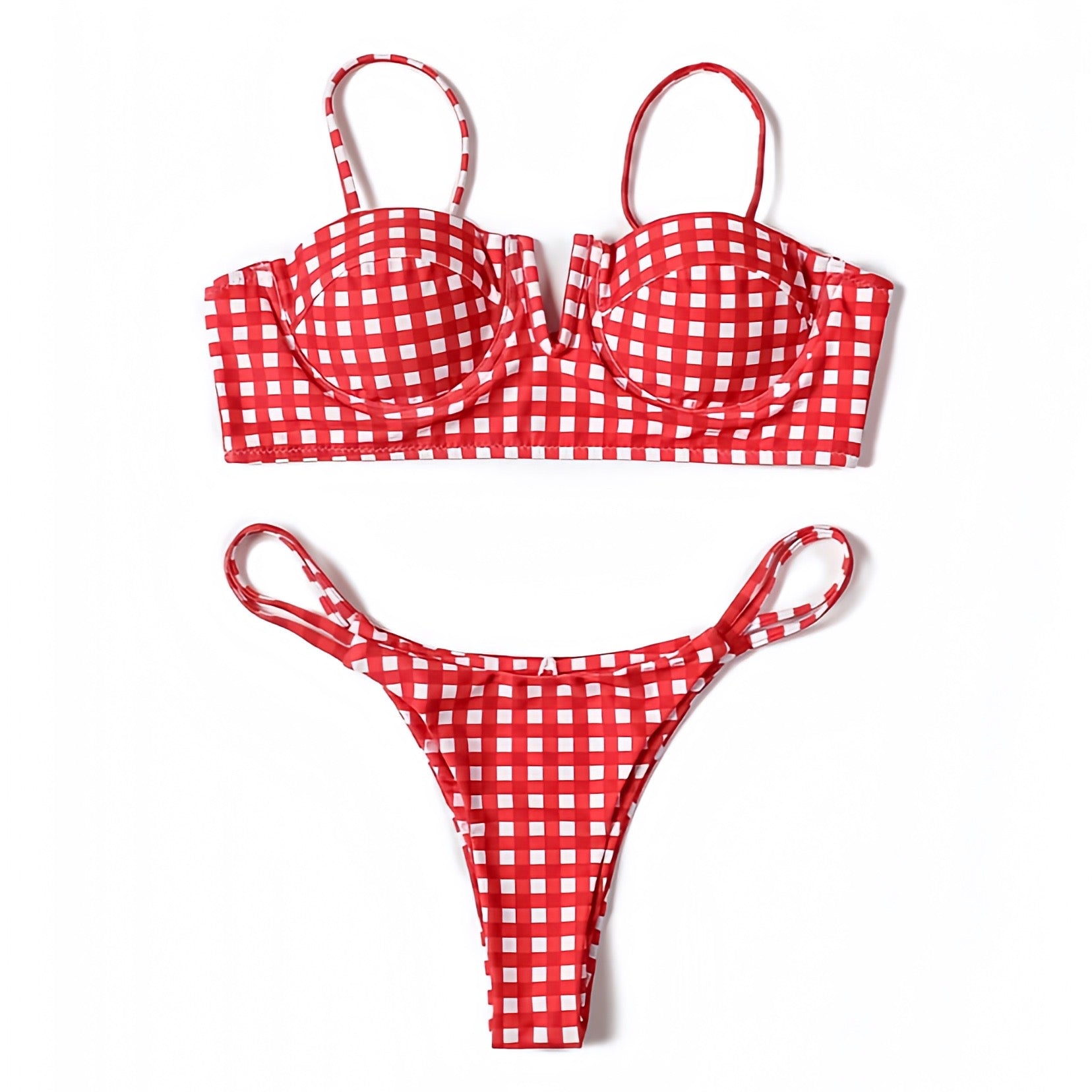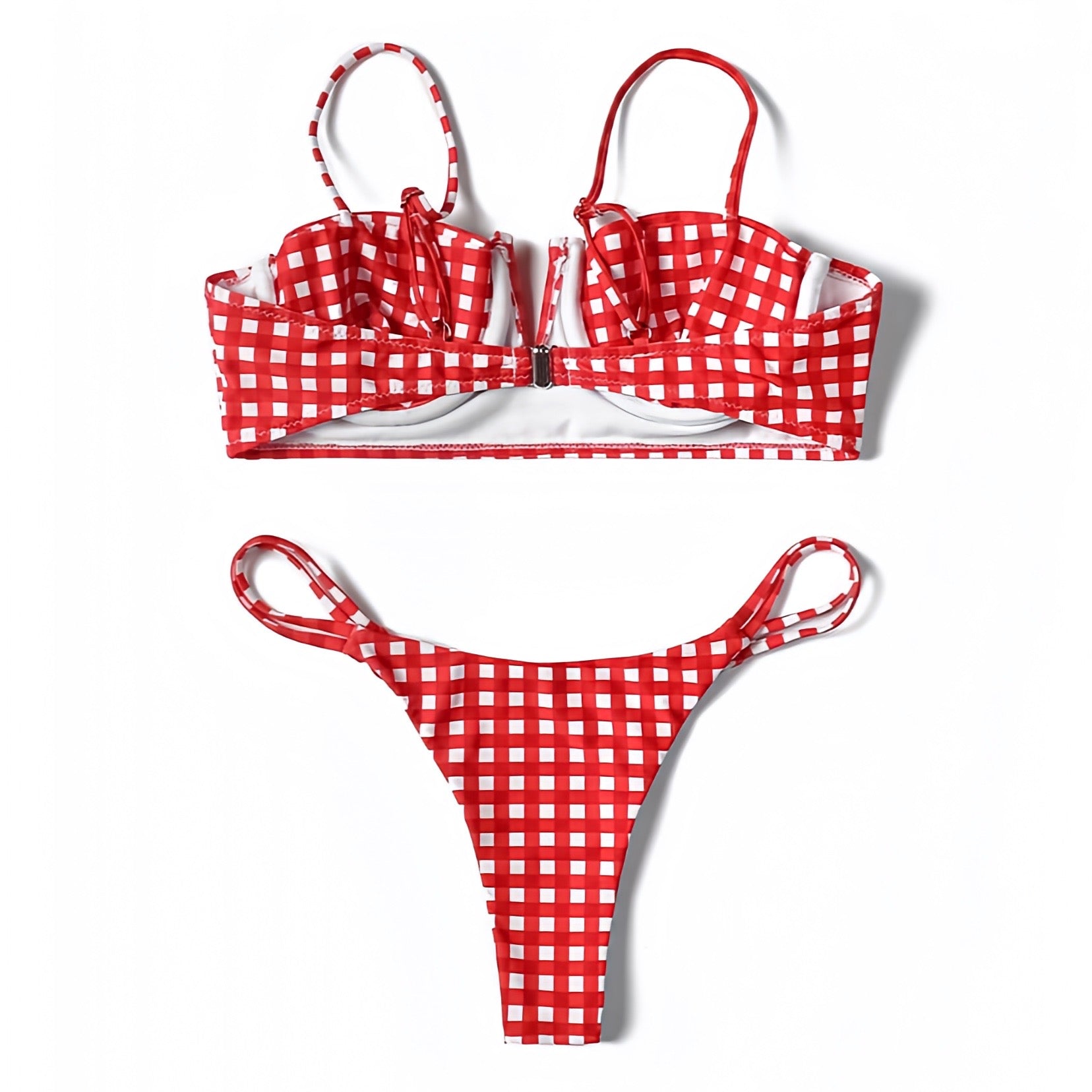 Cherry Red & White Gingham Patterned Underwire 2 Piece Bikini Set Details: