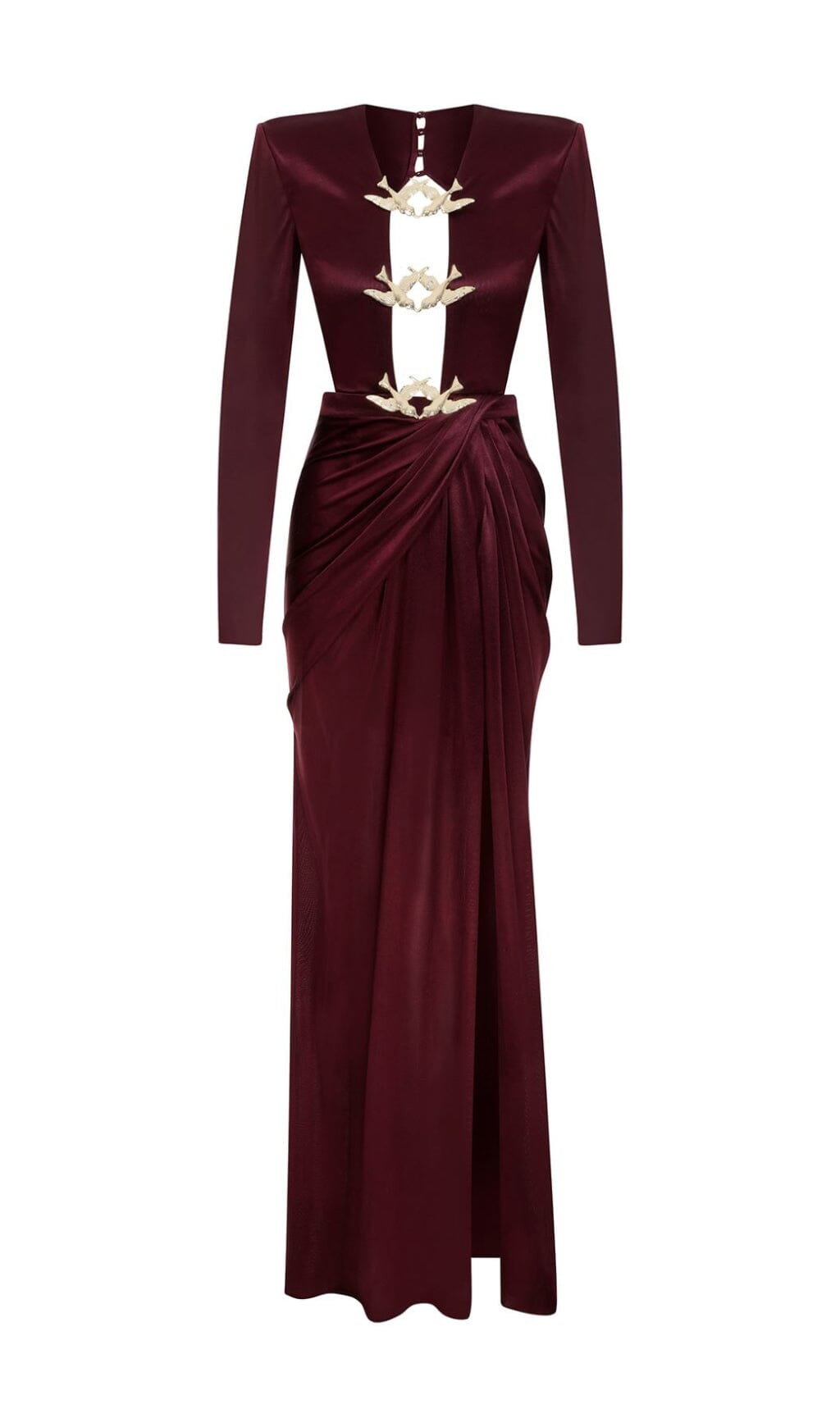 The Satin Hollow Out Long Sleeve Maxi Dress features a form-fitting silhouette with a plunging neckline and a daring open back. Perfect for any formal event. the Satin Hollow Out Long Sleeve Maxi Dress in Red is sure to turn heads wherever you go. Its stunning design and unique details make it a true showstopper. Pair the dress with your favorite heels and statement jewelry to complete the look.