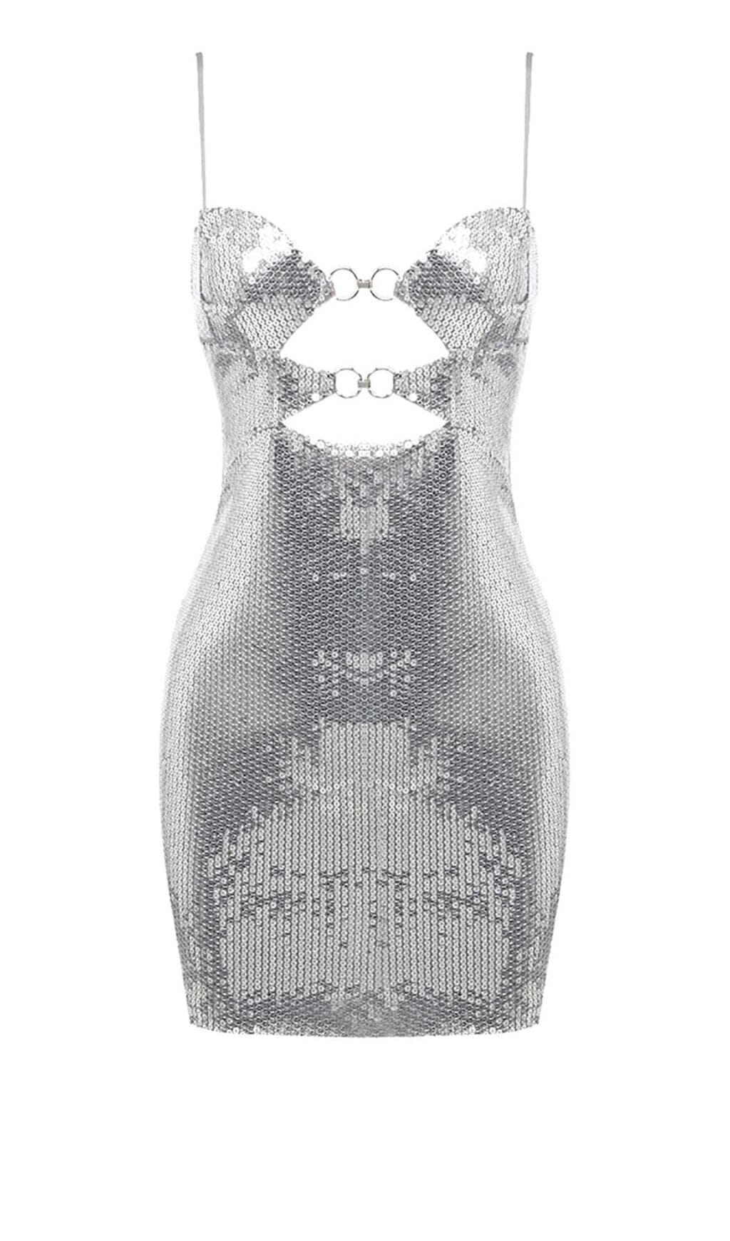 SEQUIN CUTOUT DRAPED MINI DRESS IN METALLIC SILVER