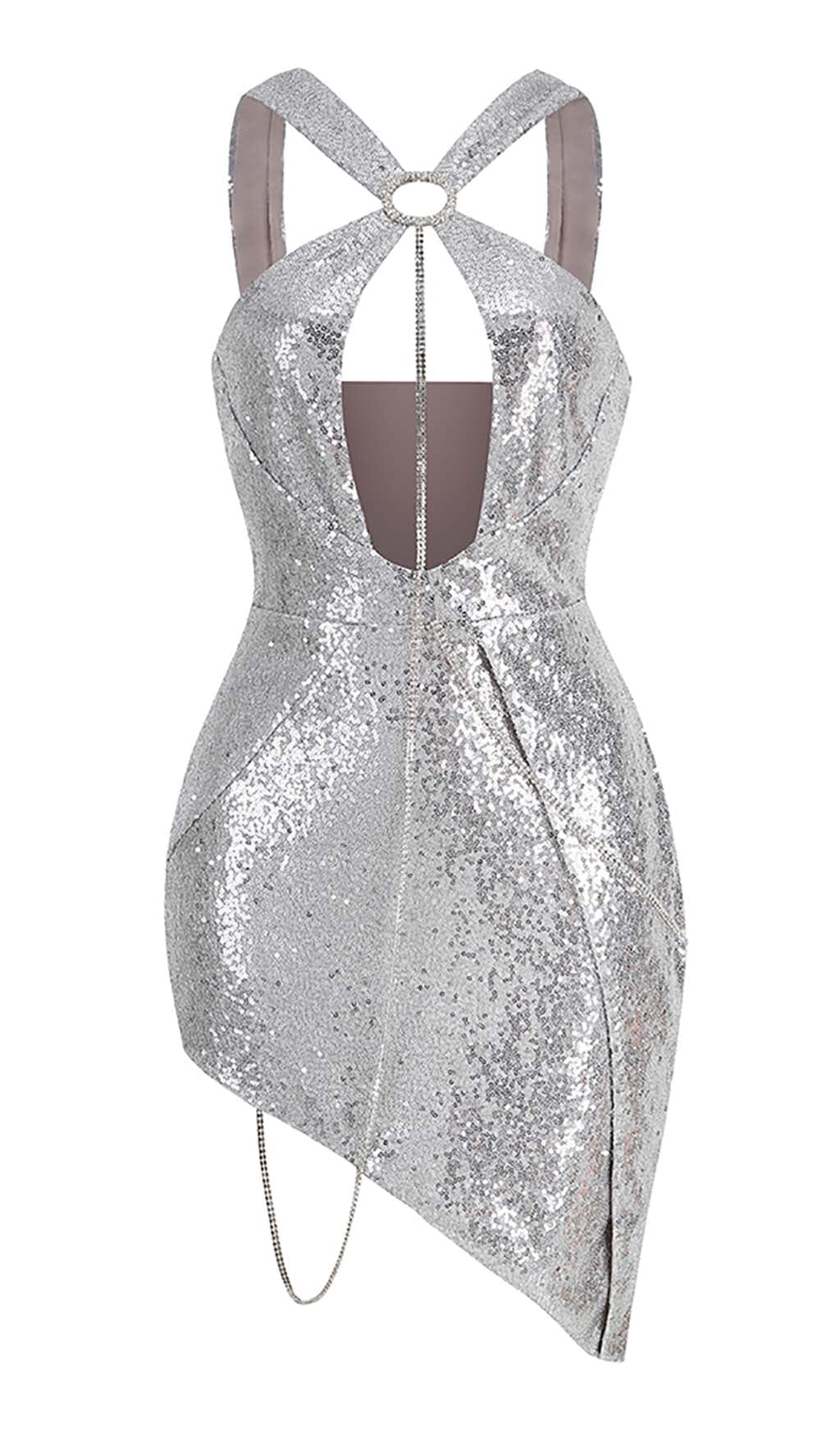 Make a Glamorous Entrance in This Mesmerizing Sequin Cutout High Low Dress in Shimmering Silver. Featuring a Figure-Hugging Bodice With a Stylish Cross-Back Detail and a Flowy High Low Skirt. This Dazzling Dress Brings Maximum Impact. Pair It With Strappy Heels for Your Next Cocktail Party or Gala Event.