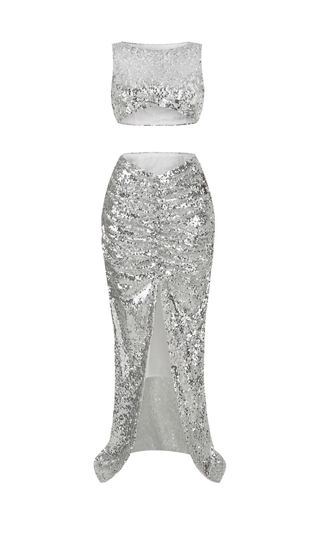 Behold the irresistible sequin slit two-piece suit in metallic silver. This captivating ensemble features a dazzling sequin-adorned top and a glamorous skirt with a daring slit. Embrace your inner diva and command attention with every step. as the sequins shimmer and the slit adds a touch of allure.