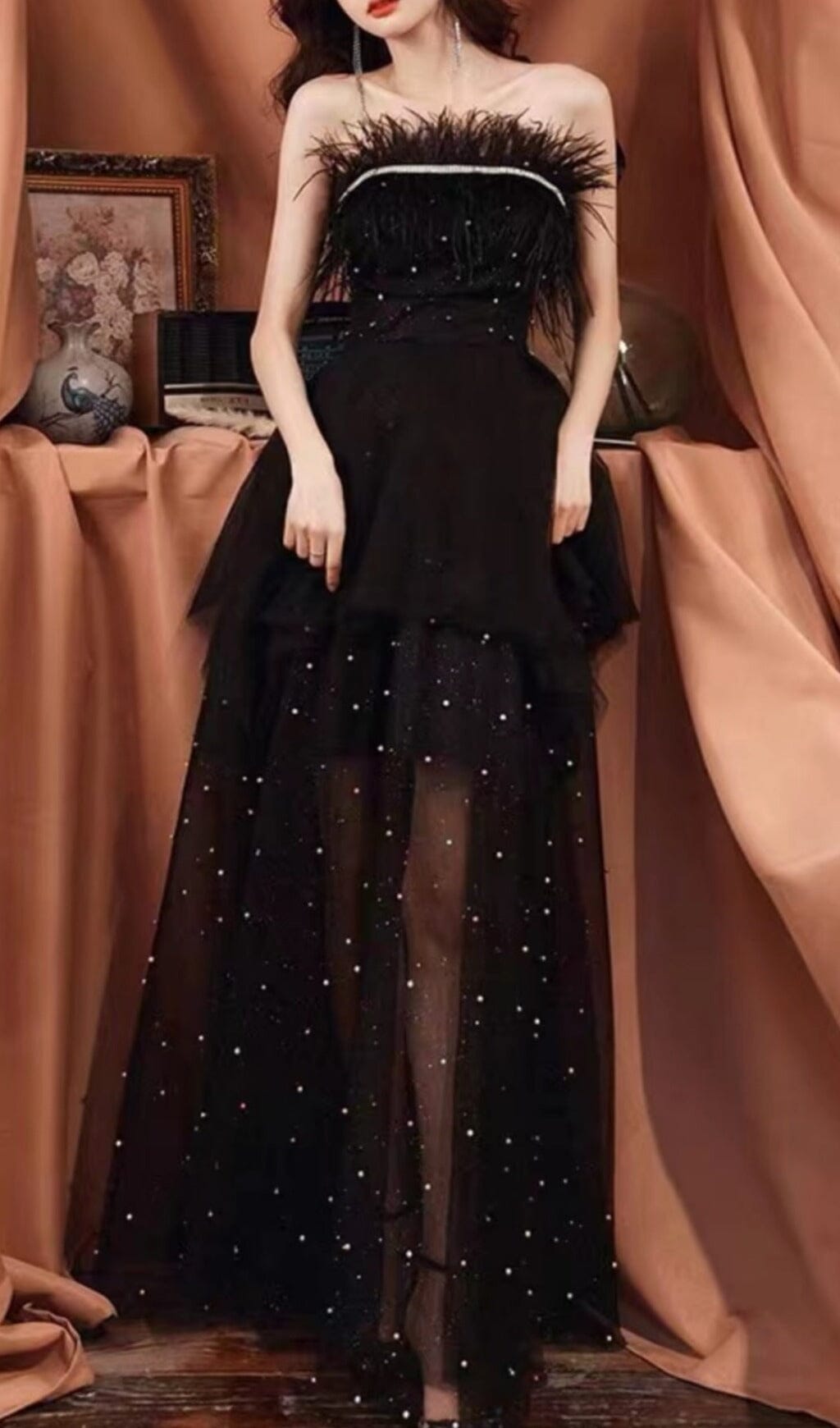 Glamorous eveningwear is designed for special occasions and life's "beautiful moments." A stunning choice. this gown is made from delicate guipure lace in a chic. strapless silhouette. It's shirred through the bodice and has pretty scalloped trims with feather .and it has a full skirt made from layers of delicate tulle. Wear yours with a deep red lip and diamonds.