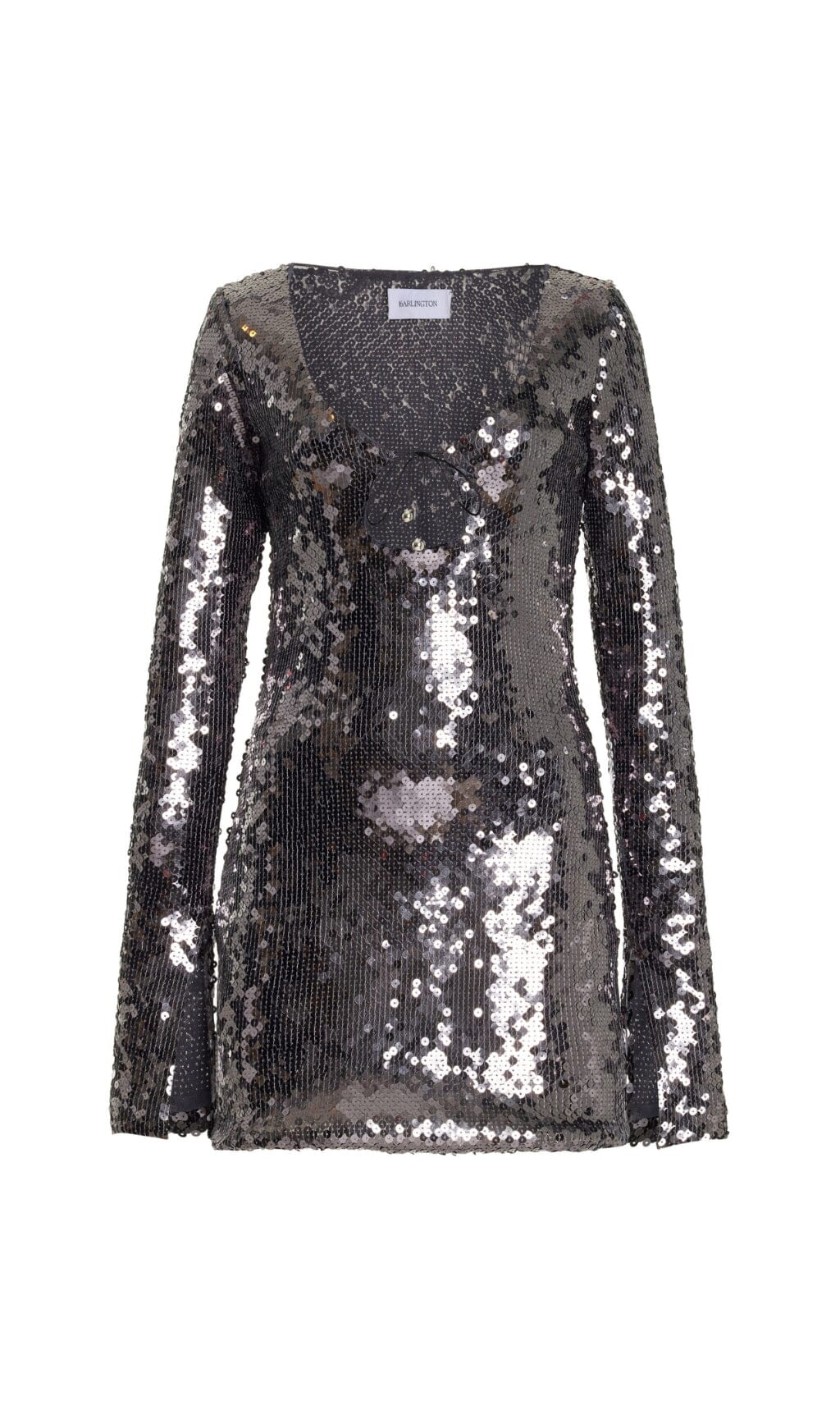 Whether you're attending a birthday celebration. or a fancy cocktail event. the Solaria Sequined Tulle Mini Dress is sure to make you stand out and shine like a star. This mini dress is crafted from a delicate tulle material that is adorned with sparkling sequins in a mesmerizing pattern. The dress features a deep V-neckline and a body-hugging silhouette that accentuates your curves. The long sleeves add a touch of elegance while providing coverage. and the mini length creates a fun and flirty look.