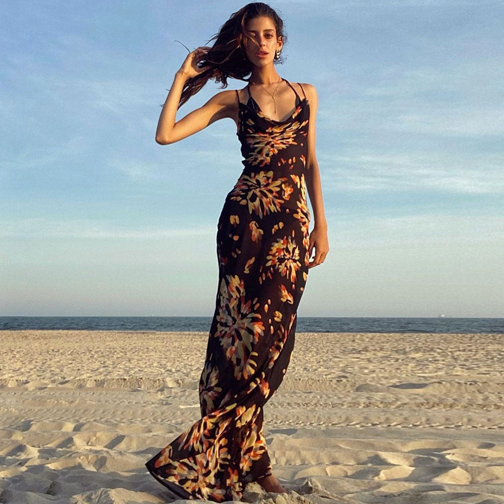 You can't go wrong with a sleek slip. Made of stretchy polyester fabric. embellished with an allover retro-inspired print. featuring a flattering fit cut along with a draped cowl neckline. adjustable slender straps on the shoulders. a self-tie closure with a cutout to the rear. and ended up with a particularly long length. Find more unique women's slip dresses or trendy clothing in our boutique. and complete a beautiful outing look with heeled sandals.