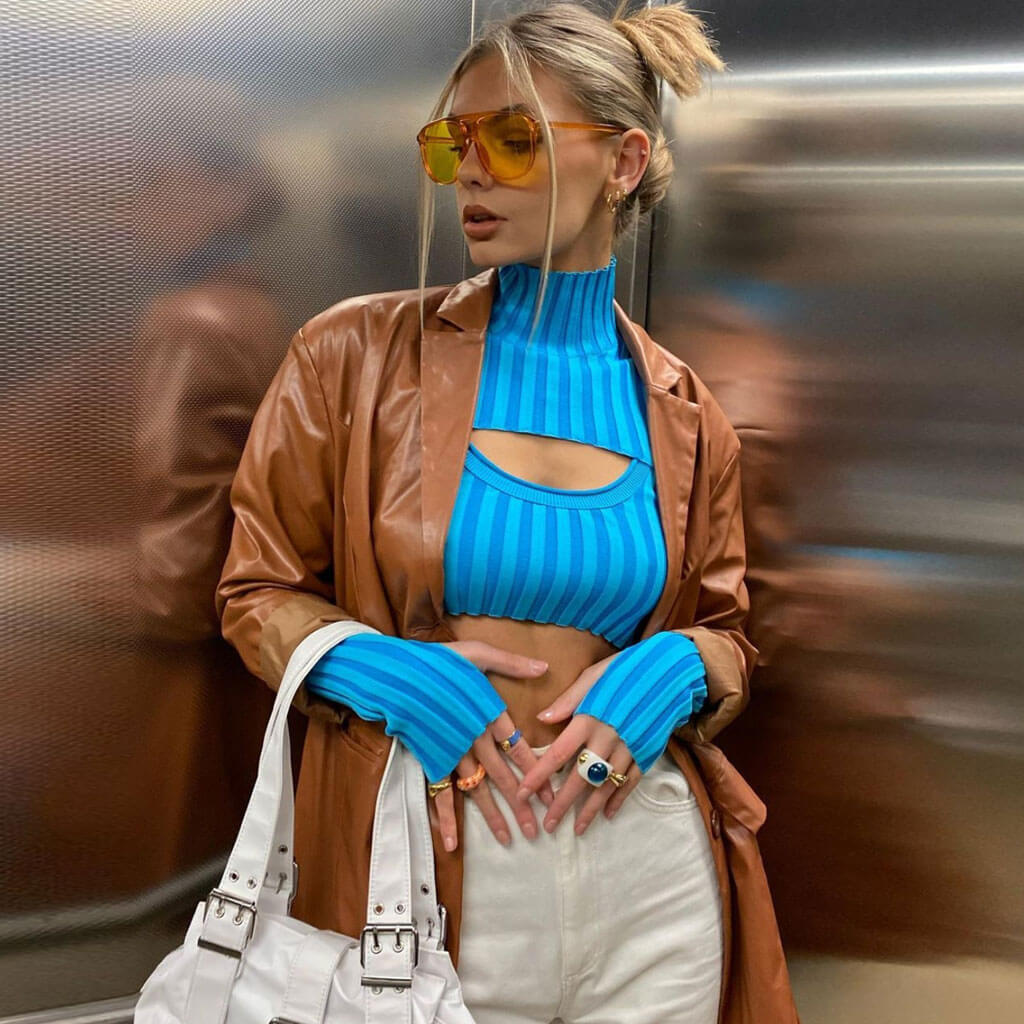 This cardigan matching set is eye-catching and weird. Made of soft ribbed jersey and polyester fabric. stand out in a two-piece profile. featuring a pullover sweater structured with a high collar. long sleeves tailored with thumb holes and a cropped length. matching with a crop tank top trimmed with uneven edges. Find more trendy women's sweaters or clothing in our boutique. and pair it with a matching baguette bag and high rise denim for a unique street look.