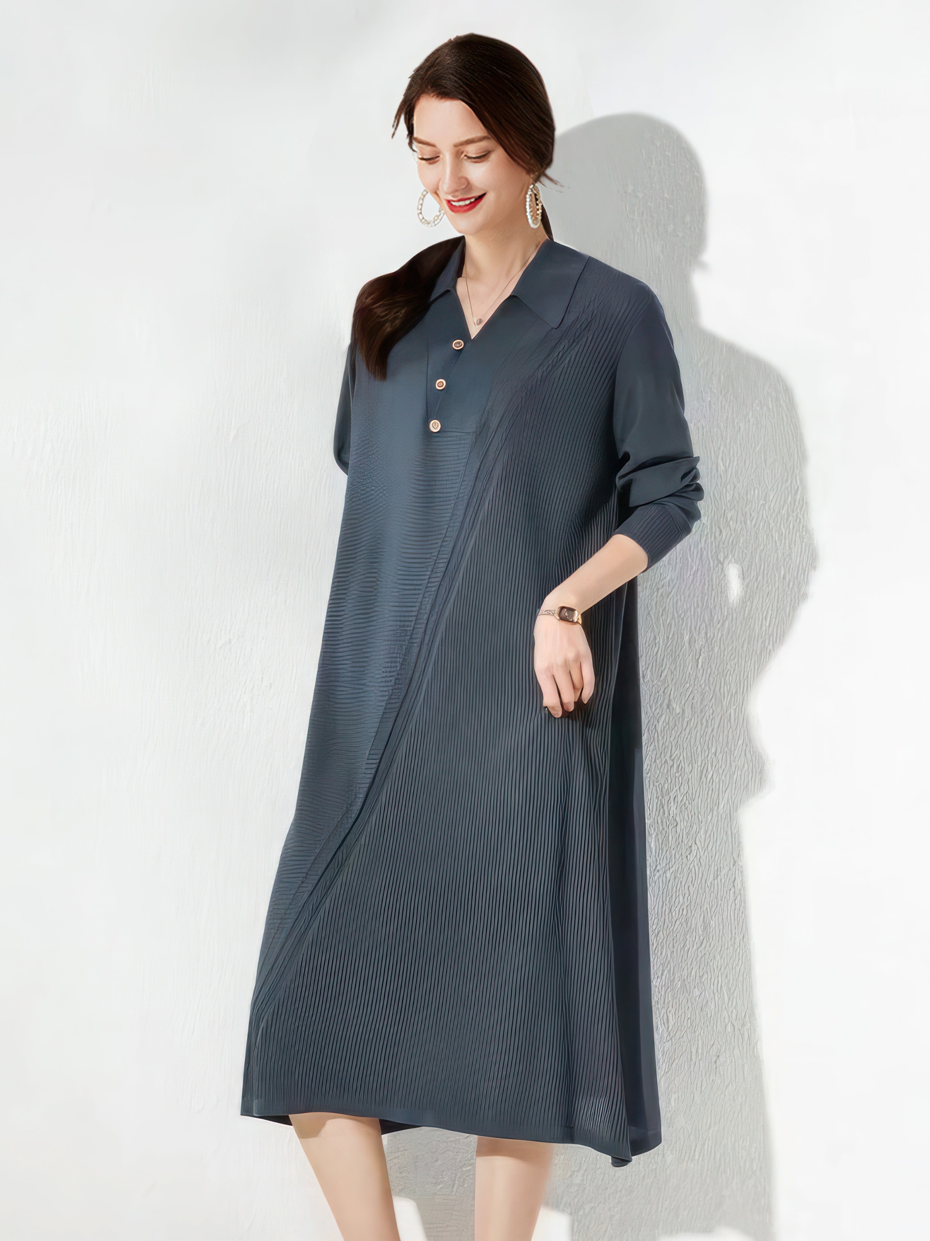 This dress is designed with a slim fit and midi length that accentuate the figure while providing comfort and breathability. The V-neck adds a touch of elegance and style. while the lightweight fabric ensures a comfortable fit. This dress is perfect for any occasion. as it gives an elegant and slimming look.